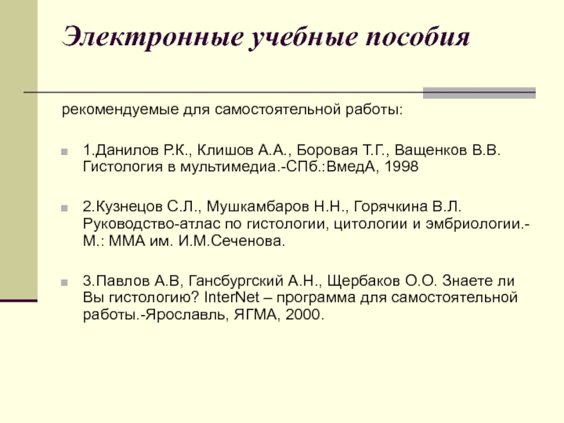 3.Павлов А.В, Гансбургский А.Н., Щербаков О.О. Знаете ли Вы гистологию? InterNet – программа для самостоятельной работы.-Ярославль, ЯГМА, 2000.