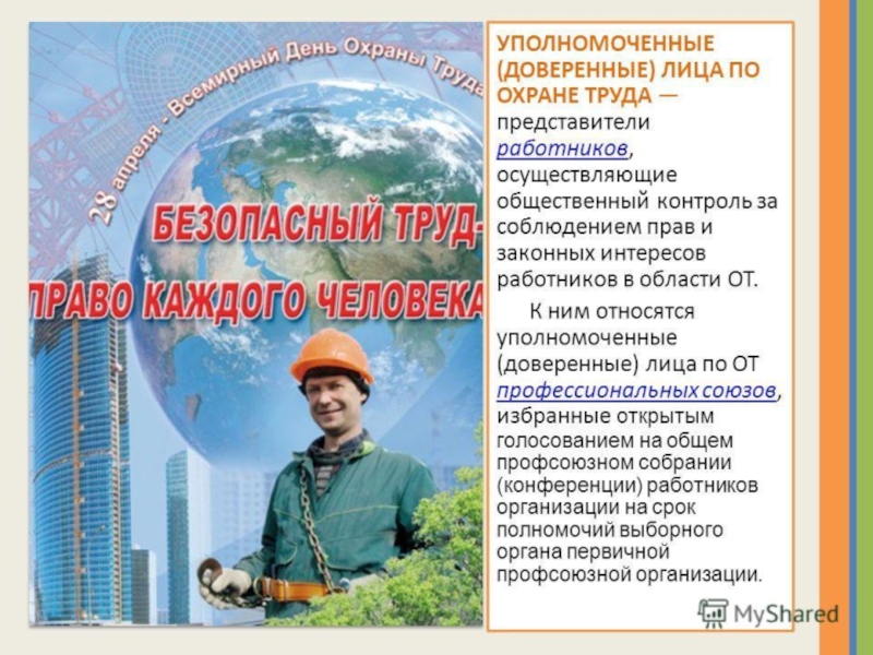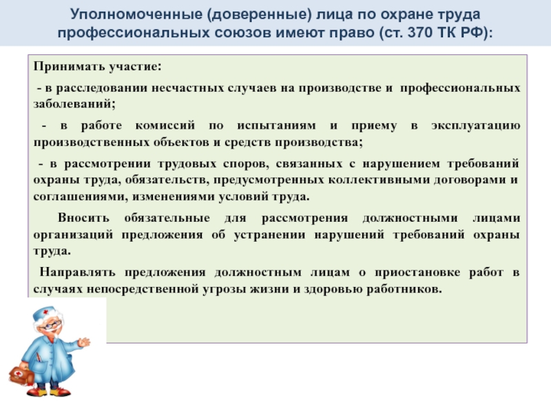 Слайд 12Уполномоченные (доверенные) лица по охране труда профессиональных союзов имеют право