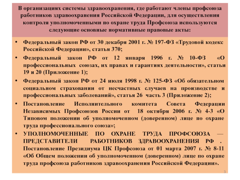 УПОЛНОМОЧЕННЫЕ ПО ОХРАНЕ ТРУДА ПРОФСОЮЗА — ПРЕДСТАВИТЕЛИ РАБОТНИКОВ ЗДРАВООХРАНЕНИЯ РФ . Постановление Президиума ЦК Профсоюза от 01 марта 2007 г. № 8-11 «Об Общем положении об уполномоченном (доверенном) лице по охране труда профсоюза работников здравоохранения Российской Федерации».