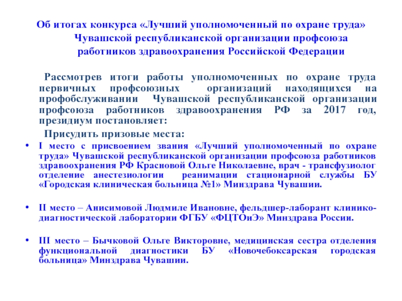 I место с присвоением звания «Лучший уполномоченный по охране труда» Чувашской республиканской организации профсоюза работников здравоохранения РФ Красновой Ольге Николаевне, врач - трансфузиолог отделение анестезиологии реанимации стационарной службы БУ «Городская клиническая больница №1» Минздрава Чувашии.