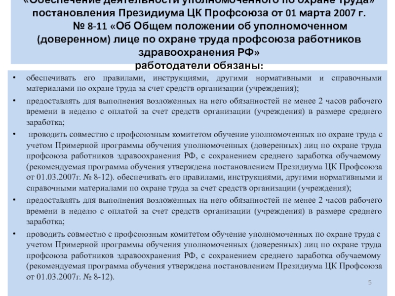 Слайд 5«Обеспечение деятельности уполномоченного по охране труда» постановления Президиума ЦК Профсоюза