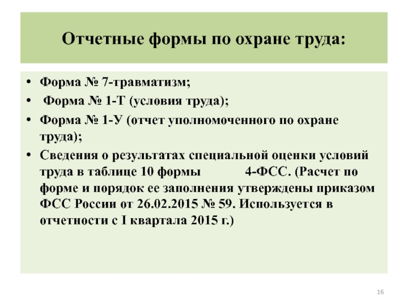 Сведения о результатах специальной оценки условий труда в таблице 10 формы 4-ФСС. (Расчет по форме и порядок ее заполнения утверждены приказом ФСС России от 26.02.2015 № 59. Используется в отчетности с I квартала 2015 г.)