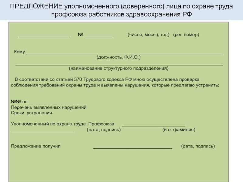 ПРЕДЛОЖЕНИЕ уполномоченного (доверенного) лица по охране труда профсоюза работников здравоохранения