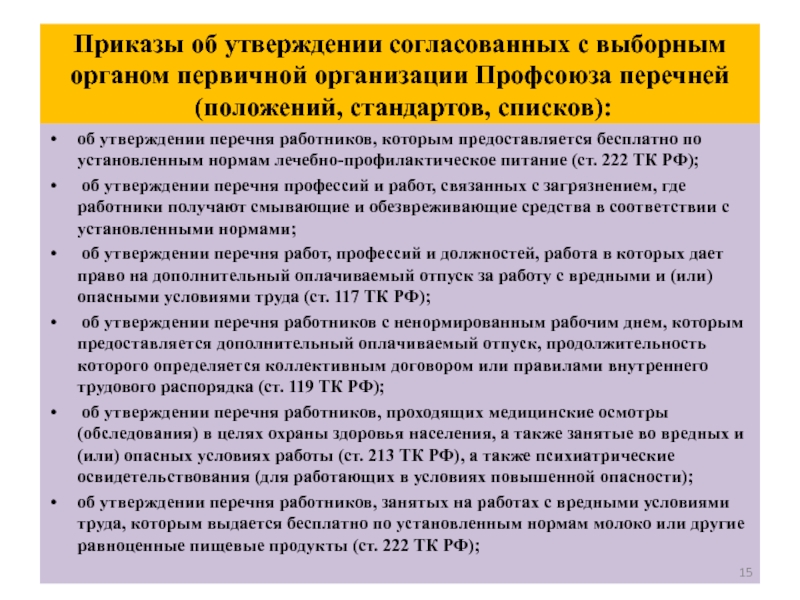 выполнение приказов руководителя организации, решений выборного профсоюзного органа, предложений уполномоченных по охране труда Профсоюза;
