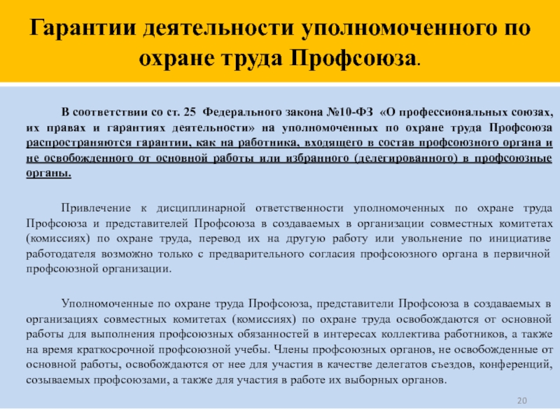 Слайд 20Гарантии деятельности уполномоченного по охране труда Профсоюза.