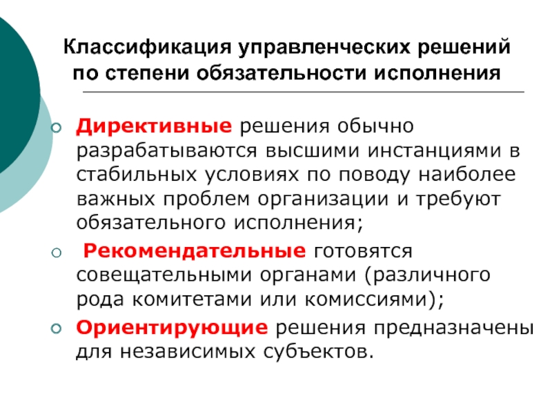 Слайд 11Классификация управленческих решений по степени обязательности исполнения