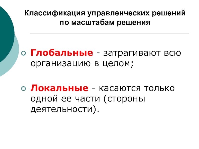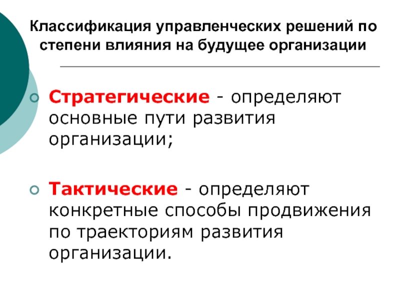 Слайд 5Классификация управленческих решений по степени влияния на будущее организации
