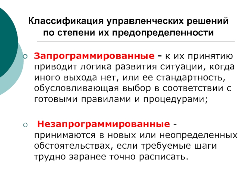 Слайд 13Классификация управленческих решений по степени их предопределенности