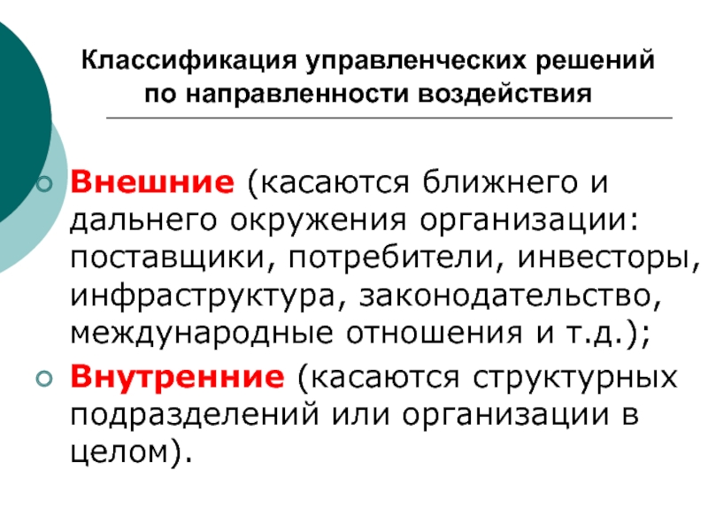 Слайд 10Классификация управленческих решений по направленности воздействия