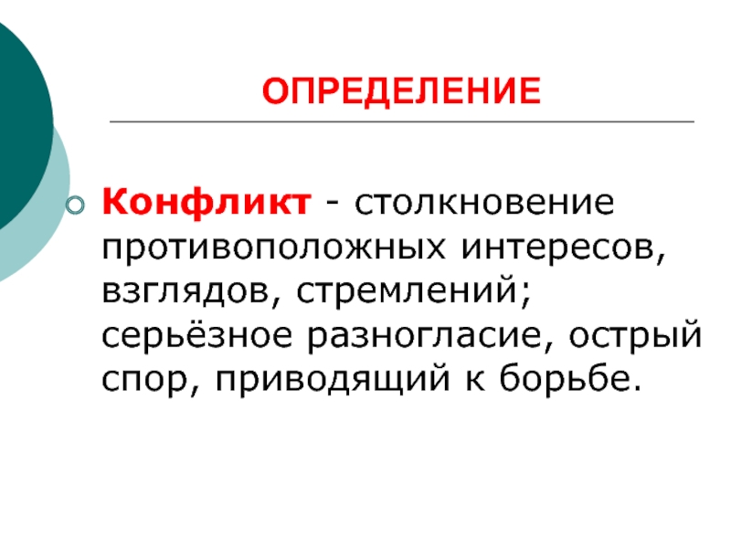 Конфликт - столкновение противоположных интересов, взглядов, стремлений; серьёзное разногласие, острый