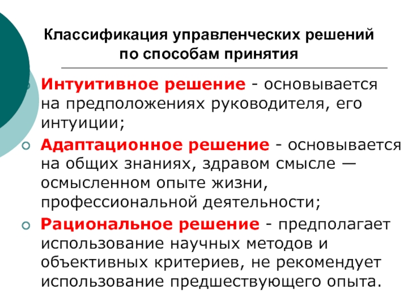 Рациональное решение - предполагает использование научных методов и объективных критериев, не рекомендует использование предшествующего опыта.