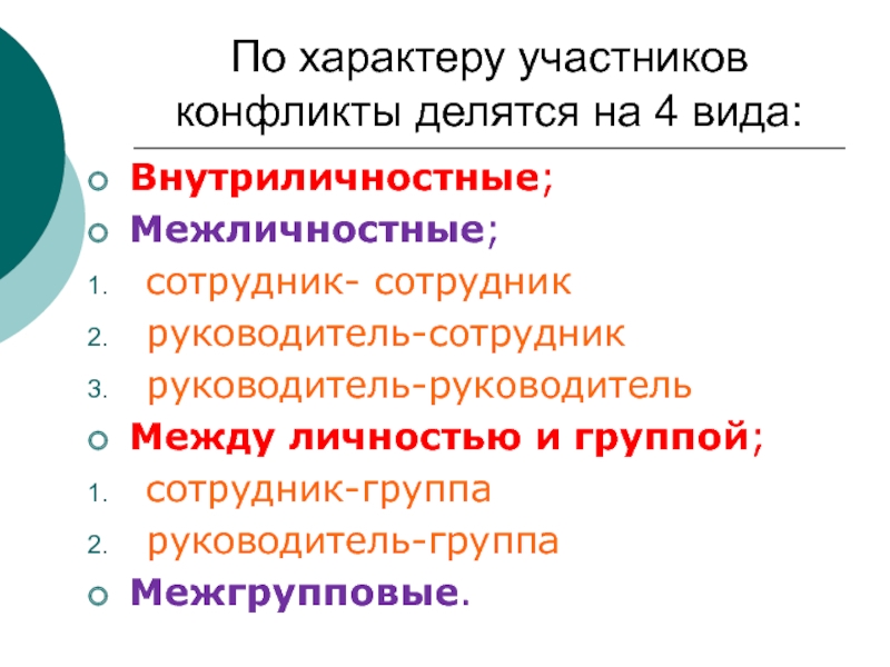 Слайд 43По характеру участников конфликты делятся на 4 вида: