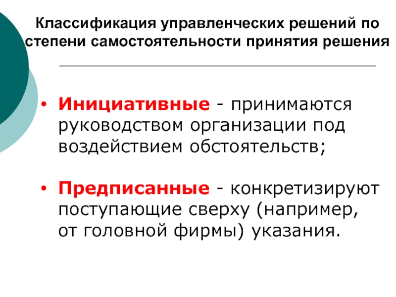 Слайд 6Классификация управленческих решений по степени самостоятельности принятия решения