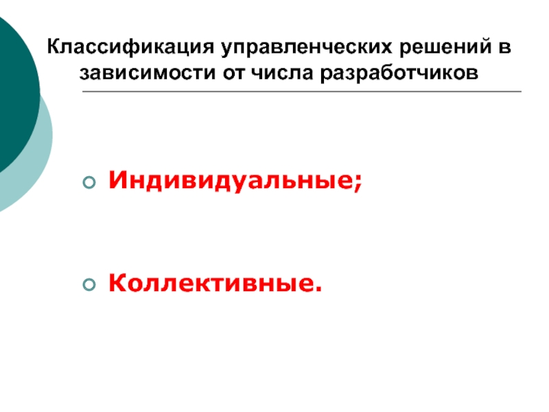 Слайд 12Классификация управленческих решений в зависимости от числа разработчиков