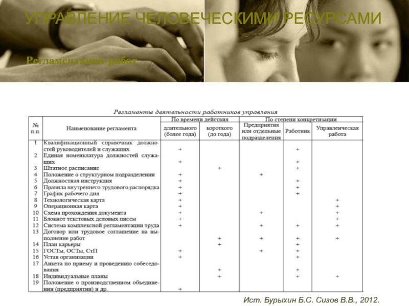 Регламентация работУПРАВЛЕНИЕ ЧЕЛОВЕЧЕСКИМИ РЕСУРСАМИИст. Бурыхин Б.С. Сизов В.В., 2012.