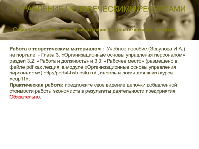 Самостоятельная работа: подготовка к практическому занятиюУПРАВЛЕНИЕ ЧЕЛОВЕЧЕСКИМИ РЕСУРСАМИРабота с теоретическим материалом : Учебное пособие (Эсаулова И.А.) на