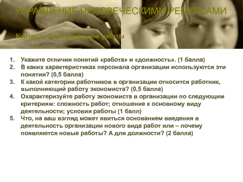 Контроль самостоятельной работыУПРАВЛЕНИЕ ЧЕЛОВЕЧЕСКИМИ РЕСУРСАМИУкажите отличия понятий «работа» и «должность». (1 балла)В каких характеристиках персонала организации используются