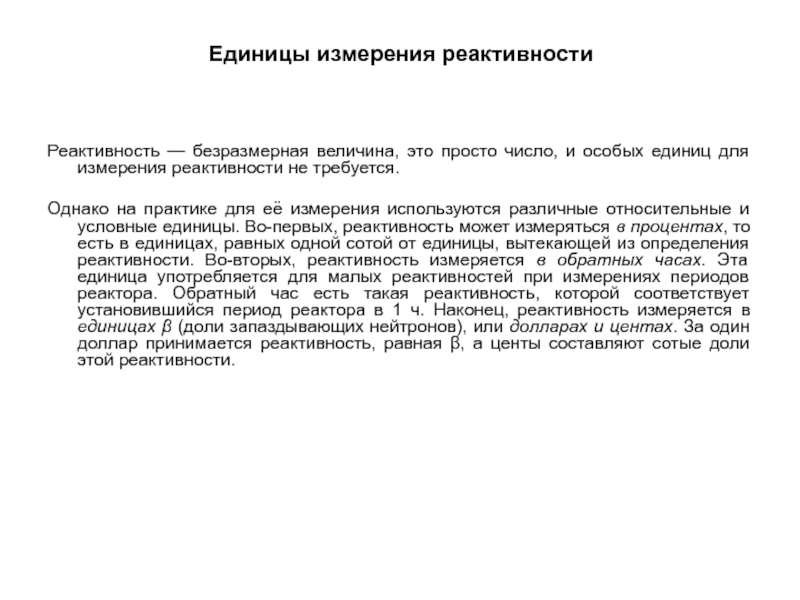 для её измерения используются различные относительные и условные единицы. Во-первых, реактивность может измеряться в процентах, то есть в единицах, равных одной сотой от единицы, вытекающей из определения реактивности. Во-вторых, реактивность измеряется в обратных часах. Эта единица употребляется для малых реактивностей при измерениях периодов реактора. Обратный час есть такая реактивность, которой соответствует установившийся период реактора в 1 ч. Наконец, реактивность измеряется в единицах β (доли запаздывающих нейтронов), или долларах и центах. За один доллар принимается реактивность, равная β, а центы составляют сотые доли этой реактивности.