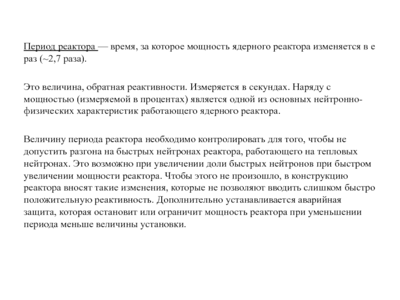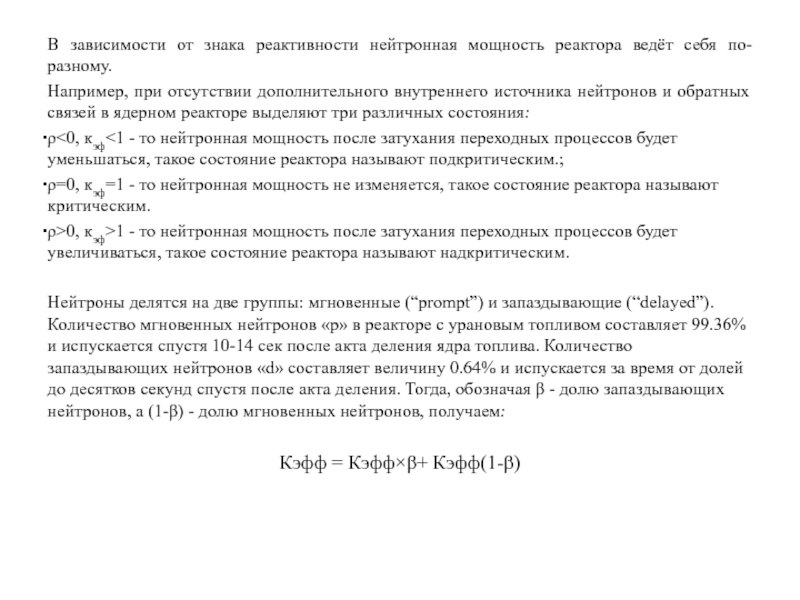 ρ<0, кэф<1 - то нейтронная мощность после затухания переходных процессов будет уменьшаться, такое состояние реактора называют подкритическим.;