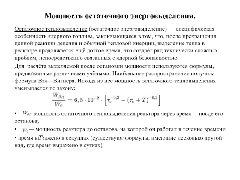 Формула Уинтермайера—Уэллса позволяет учитывать вклад распада 235U и 239Pu в остаточное тепловыделение: