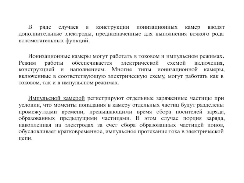 Импульсной камерой регистрируют отдельные заряженные частицы при условии, что моменты попадания в камеру отдельных частиц будут разделены промежутками времени, превышающими время сбора носителей заряда, образованных предыдущими частицами. В этом случае порция заряда, накопленная на электродах за счет сбора образованных частицей ионов, обусловливает кратковременное, импульсное протекание тока в электрической цепи.