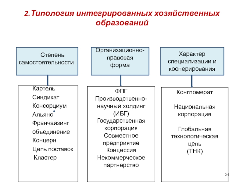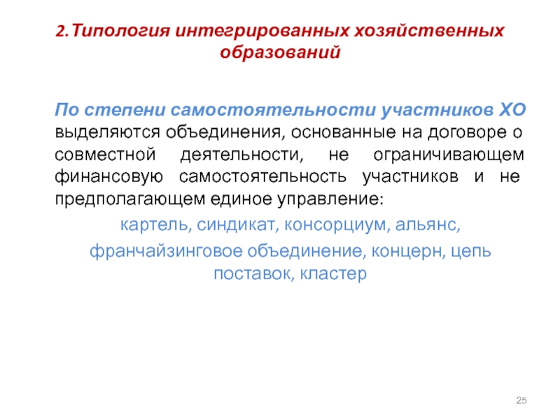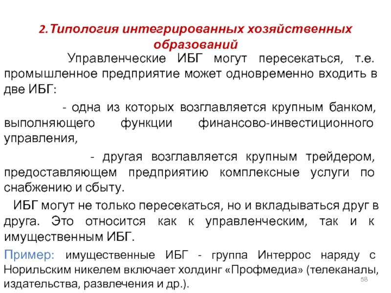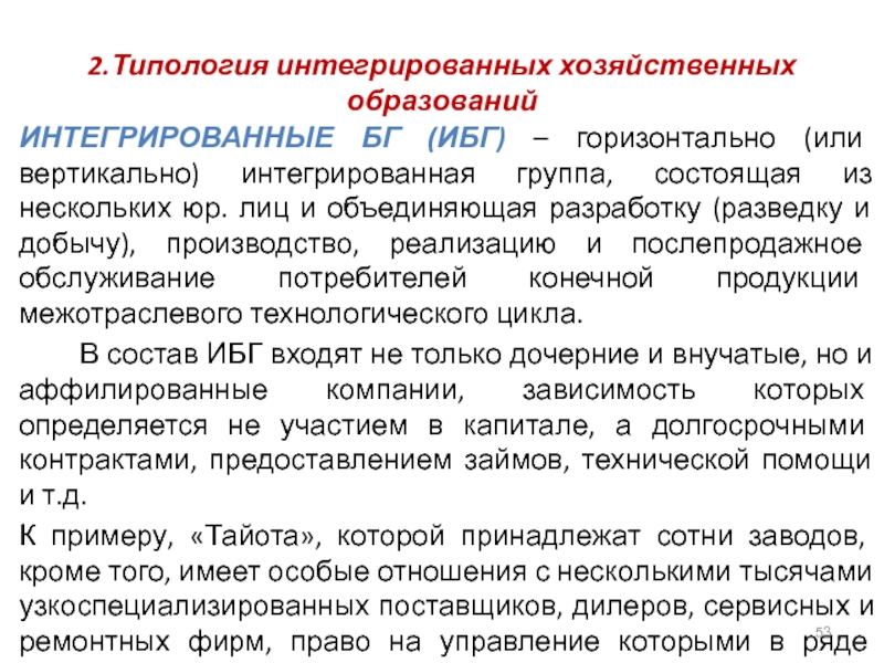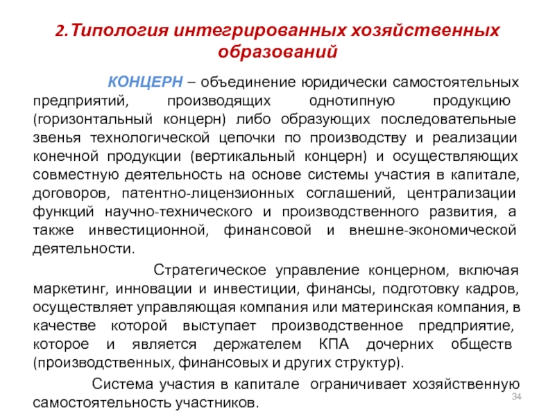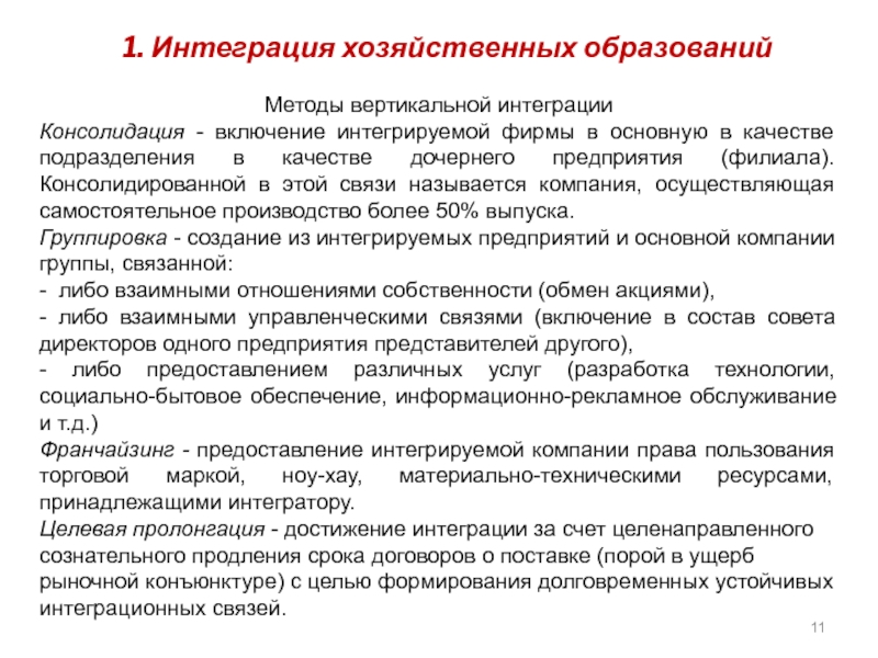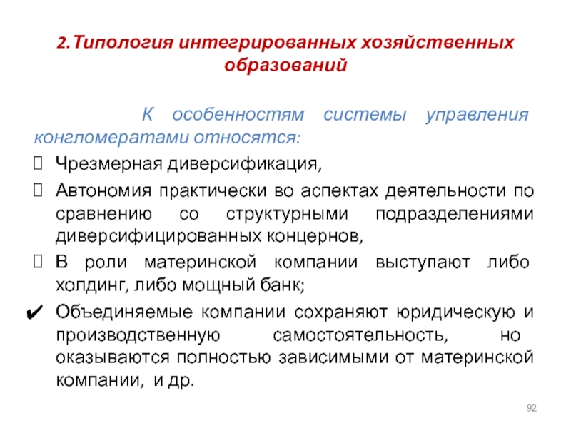Объединяемые компании сохраняют юридическую и производственную самостоятельность, но оказываются полностью зависимыми от материнской компании, и др.