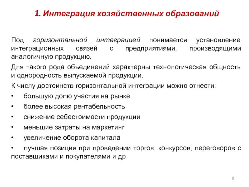 Слайд 8Под горизонтальной интеграцией понимается установление интеграционных связей с предприятиями, производящими