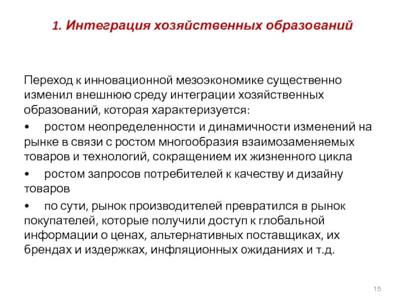 Поиск оптимального пути организации экономики в условиях естественного развития индустриального общества привел к понятию интеграции как обобщающего процесса установления наиболее эффективной организационно-функциональной и управленческой структуры.