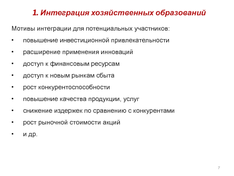 Слайд 7Мотивы интеграции для потенциальных участников: