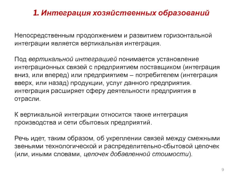 Слайд 9Непосредственным продолжением и развитием горизонтальной интеграции является вертикальная интеграция.