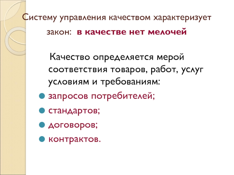 Слайд 3Систему управления качеством характеризует закон: в качестве нет мелочей