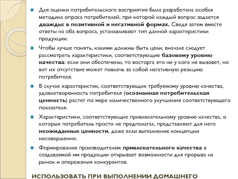 Характеристики, соответствующие привлекательному уровню качества, о которых потребитель просто не предполагал, представляют для него неожиданные ценности, даже если выполнение концепции несовершенно.