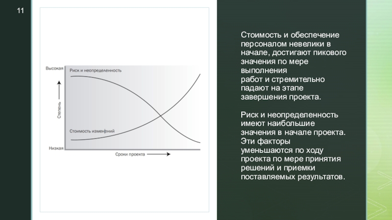 Риск и неопределенность имеют наибольшие значения в начале проекта. Эти факторы