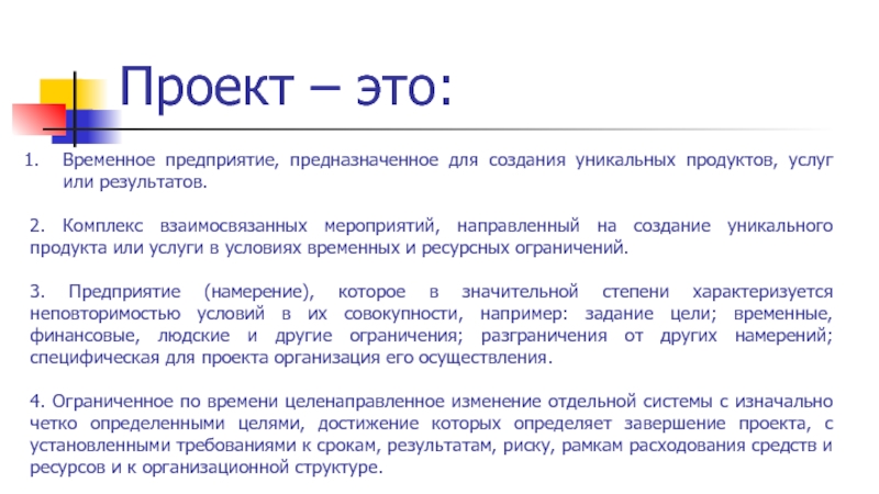 или услуги в условиях временных и ресурсных ограничений.3. Предприятие (намерение), которое в значительной степени характеризуется неповторимостью условий в их совокупности, например: задание цели; временные, финансовые, людские и другие ограничения; разграничения от других намерений; специфическая для проекта организация его осуществления.