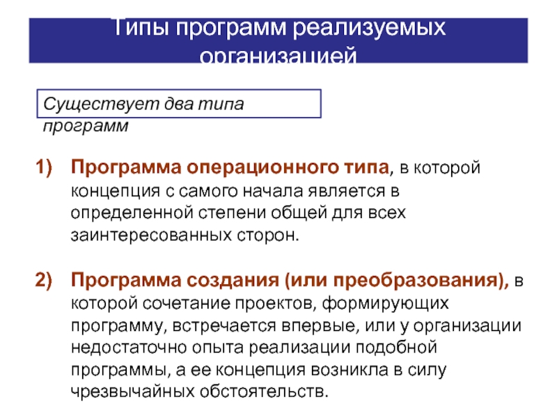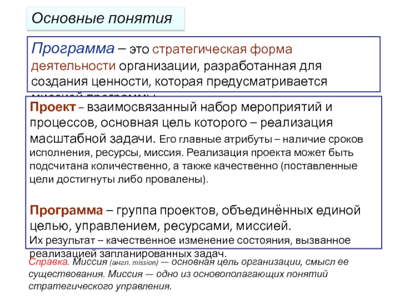 Программа – это стратегическая форма деятельности организации, разработанная для