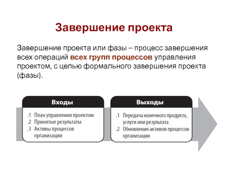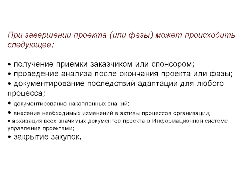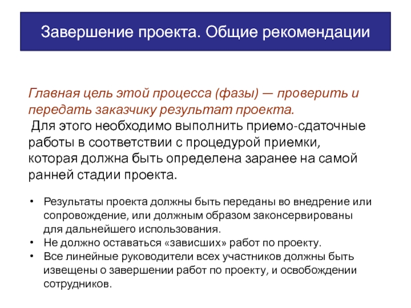 Результаты проекта должны быть переданы во внедрение или сопровождение, или должным образом законсервированы для дальнейшего использования.