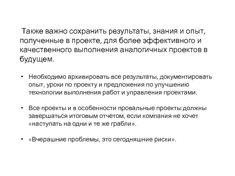 Необходимо архивировать все результаты, документировать опыт, уроки по проекту и предложения по улучшению технологии выполнения работ и управления проектами.