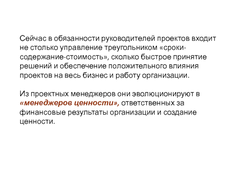 Из проектных менеджеров они эволюционируют в «менеджеров ценности», ответственных за финансовые результаты организации и создание ценности.
