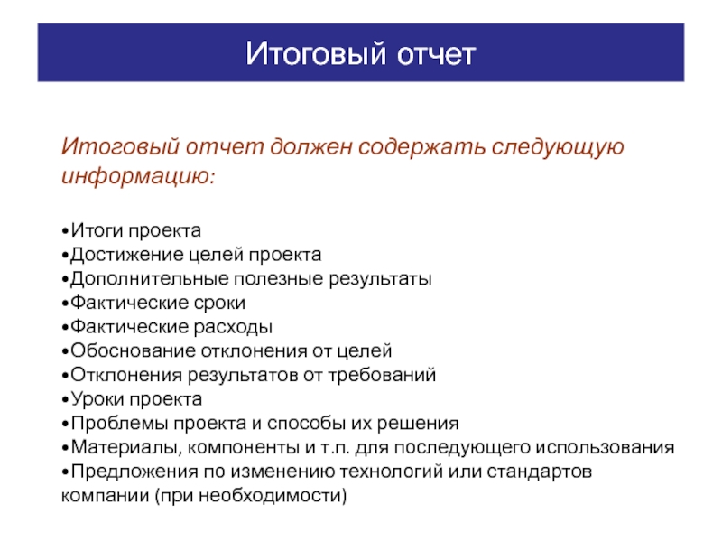Все проекты и в особенности провальные проекты должны завершаться итоговым отчетом, если компания не хочет «наступать на одни и те же грабли».