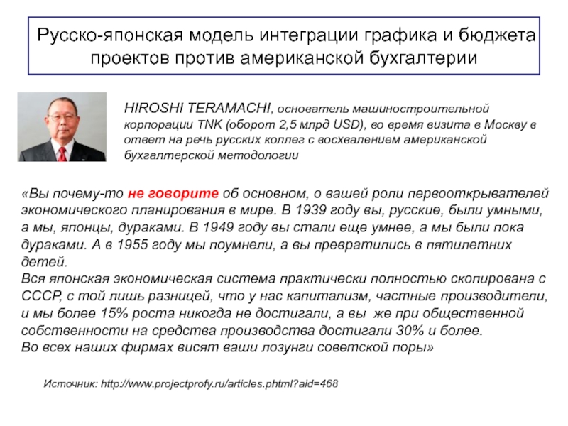 HIROSHI TERAMACHI, основатель машиностроительной корпорации TNK (оборот 2,5 млрд USD), во время визита в Москву в ответ на речь русских коллег с восхвалением американской бухгалтерской методологии