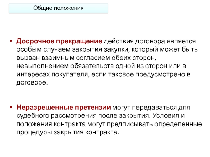 Неразрешенные претензии могут передаваться для судебного рассмотрения после закрытия. Условия и положения контракта могут предписывать определенные процедуры закрытия контракта.
