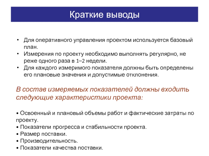В состав измеряемых показателей должны входить следующие характеристики проекта: