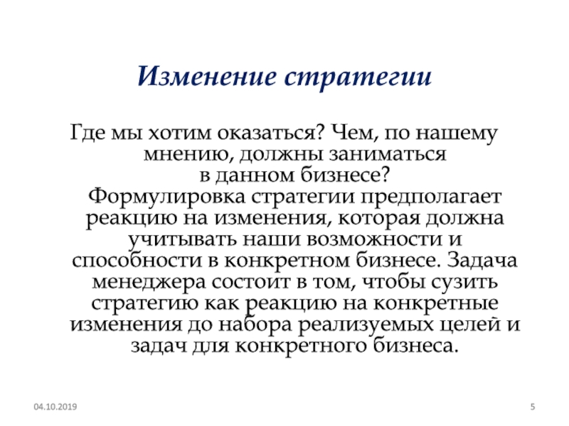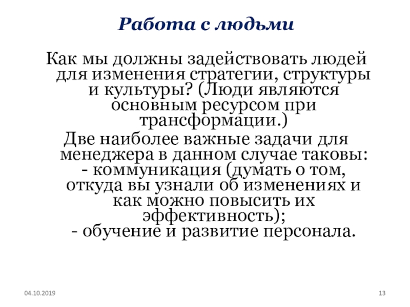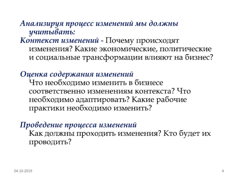 Что необходимо изменить в бизнесе соответственно изменениям контекста? Что необходимо адаптировать? Какие рабочие практики необходимо изменить? Проведение процесса изменений Как должны проходить изменения? Кто будет их проводить?