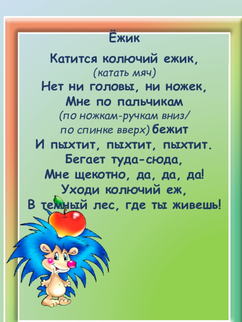 (все движения выполняются в соответствии с текстом, ежика гладим, чешем щекочем. на слова « по тропке убежал» мячик можно катать по столу, коленкам)