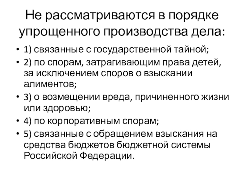 Слайд 5Не рассматриваются в порядке упрощенного производства дела: