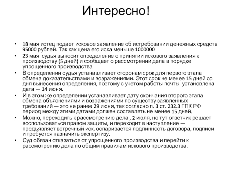 18 мая истец подает исковое заявление об истребовании денежных средств