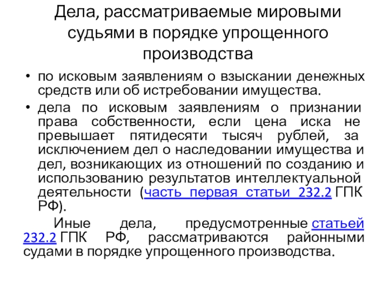исковым заявлениям о признании права собственности, если цена иска не превышает пятидесяти тысяч рублей, за исключением дел о наследовании имущества и дел, возникающих из отношений по созданию и использованию результатов интеллектуальной деятельности (часть первая статьи 232.2 ГПК РФ).