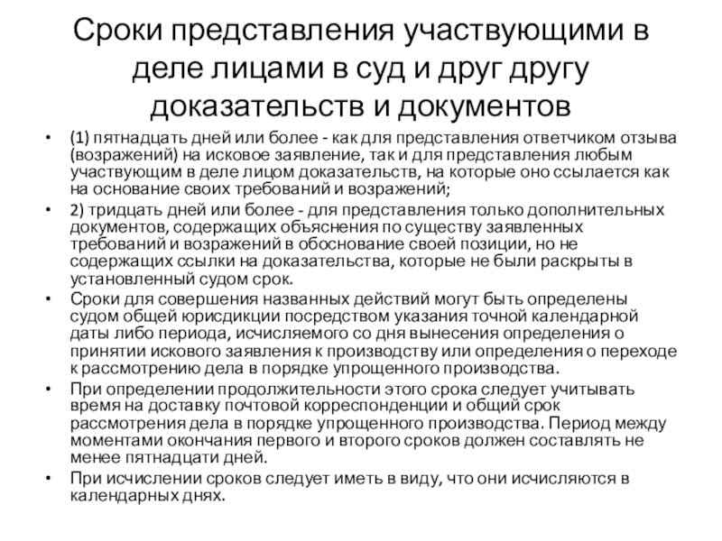 Слайд 8Сроки представления участвующими в деле лицами в суд и друг