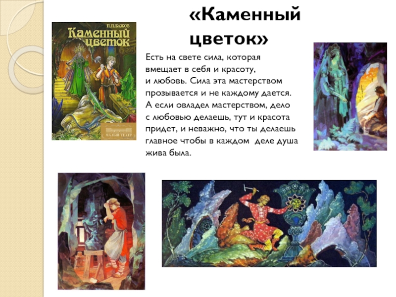 «Каменный цветок»Есть на свете сила, которая вмещает в себя и красоту, и любовь. Сила эта мастерствомпрозывается и