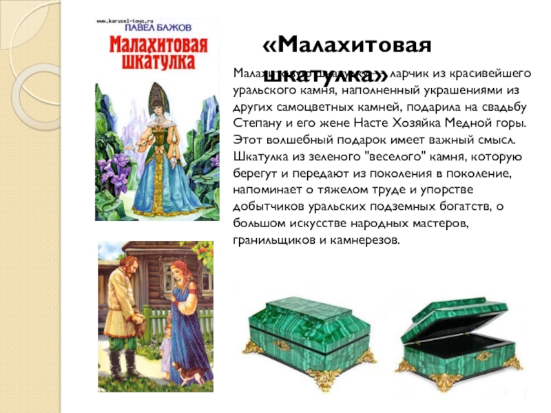 его жене Насте Хозяйка Медной горы. Этот волшебный подарок имеет важный смысл. Шкатулка из зеленого "веселого" камня, которую берегут и передают из поколения в поколение, напоминает о тяжелом труде и упорстве добытчиков уральских подземных богатств, о большом искусстве народных мастеров, гранильщиков и камнерезов.